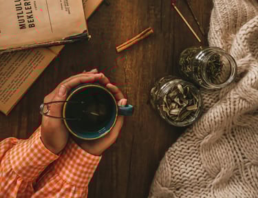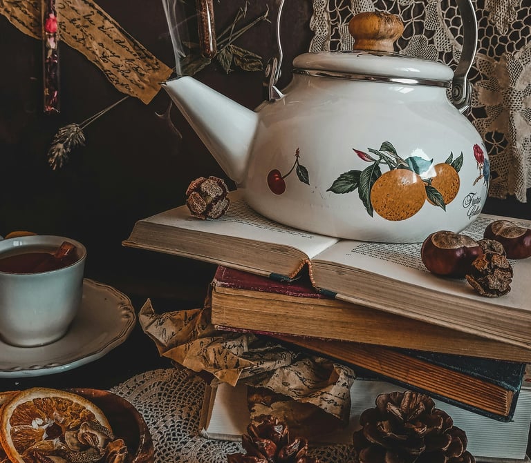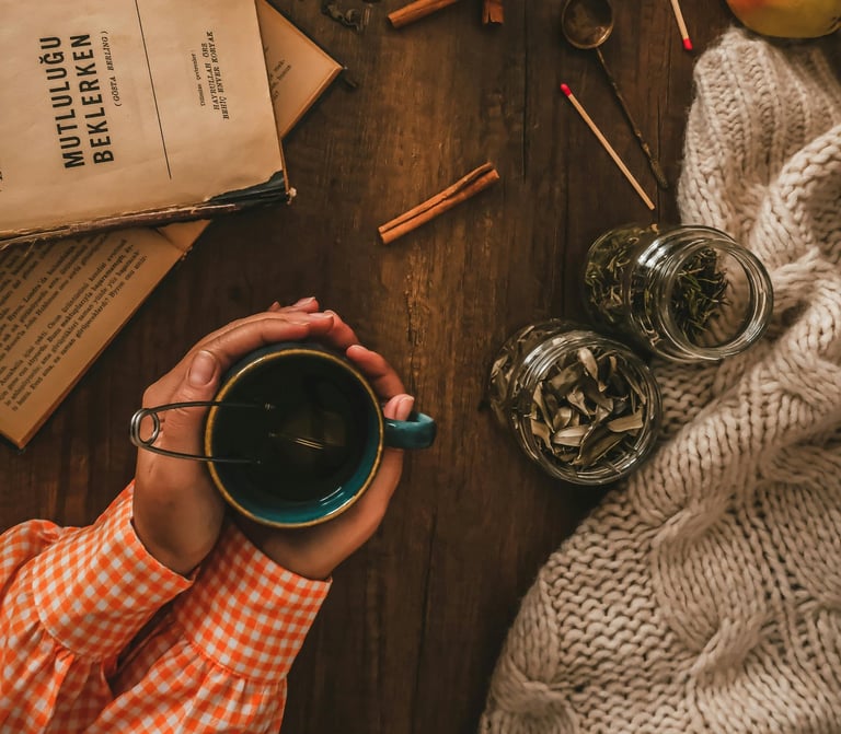 Und ganz grundsätzlich: Hol einfach das raus, was dich selbst gemütlich stimmt. Vielleicht dein Schachbrett für lange Spieleabende, extra Wolldecken oder die Lichterkette vom Weihnachtsbaum. Ich liebe es auch, meine Sticksachen griffbereit zu haben, ein Vorratsglas mit Teebeuteln zu füllen oder das Windlicht von draußen nach innen zu holen. Auch Lieblingsbücher, hübsch gestapelt, können eine tolle Deko sein – genauso wie ein paar Zimtstangen, die vom letzten Weihnachten übrig sind. Oft sind es genau diese kleinen Dinge, die es richtig cozy machen.